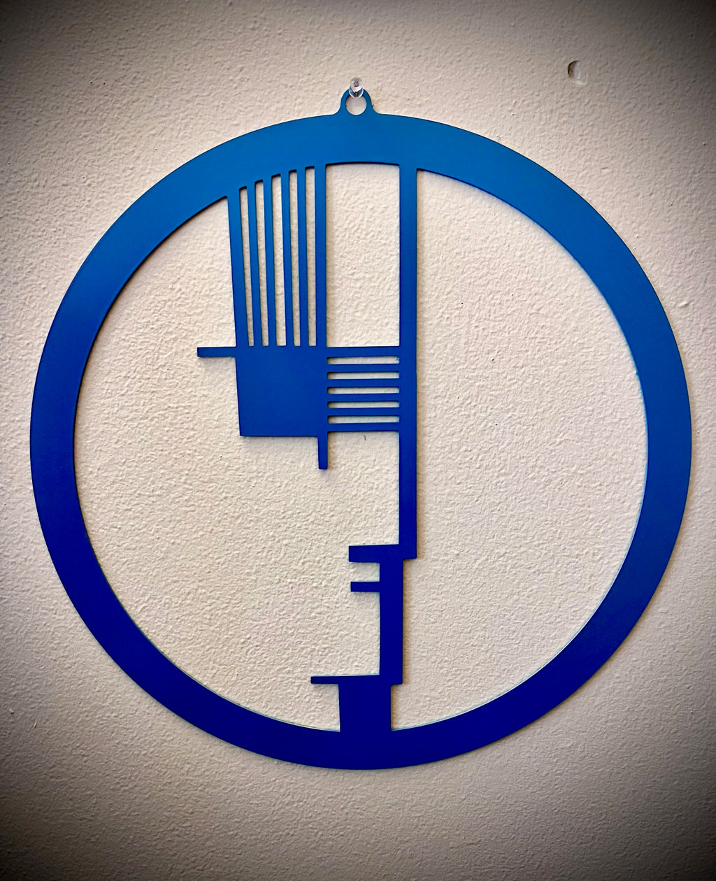 Inspired by the band Bauhaus' logo, this statement piece draws all attention in a gothic music fan's space. Heavily influenced by its namesake, this logo was altered to honor the Brutalist vision of aesthetics from Germany. It is an alteration that I hope the band would look fondly upon.